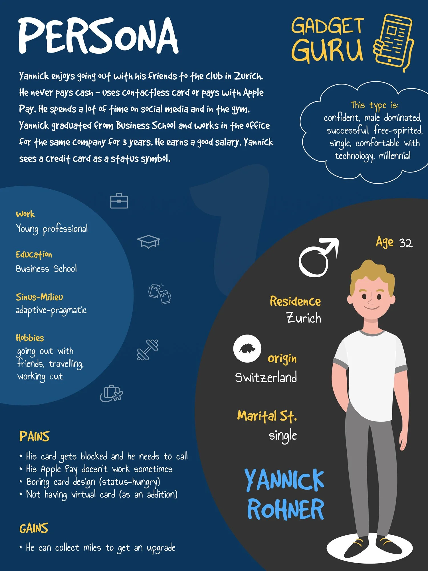 Looking at Switzerland in particular (using research from Sinus Institute) my Personas fall into two categories: adaptiv-pragmatic (in German: Adaptiv-pragmatisch) and established (in German: Arriviert). Adaptiv-pragmatic are young, practical, adaptable middle class, while established are well-situated, sovereign social elite.